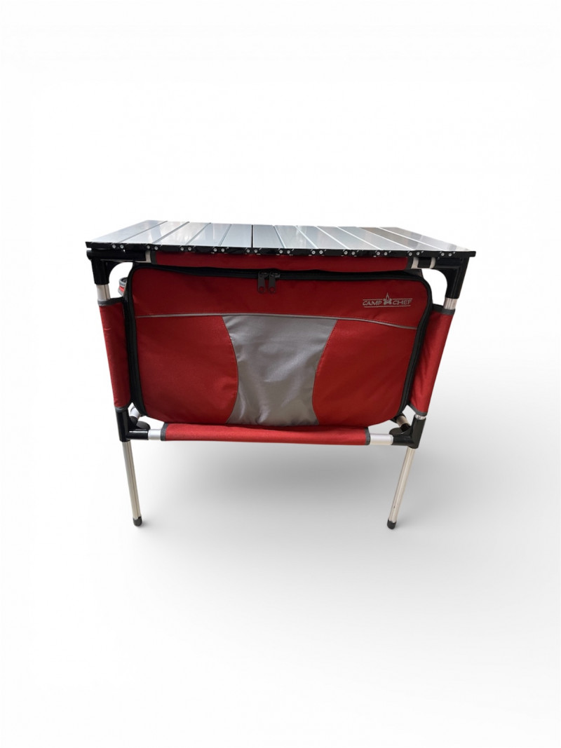 Camp Chef Portable Table & Cooler Combo. ~ SHIPPING NOT AVAILABLE ~ Versatile outdoor essential from Camp Chef, combining a sturdy folding prep table with an integrated soft-sided cooler for convenient campsite organization. Ideal for camping, tailgating, fishing trips, or backyard gatherings, this all-in-one setup keeps food prep space and cold storage in one compact, portable unit. Adjustable legs for height. Designed for easy transport and quick setup, it’s a practical solution for outdoor cooking and entertaining. Features: Durable folding prep table surface Integrated insulated cooler compartment Lightweight, portable design Quick setup and fold-down for storage Ideal for camping, tailgating, and outdoor events Please review photos for condition. A great addition to any outdoor gear collection. 27 x 17 x 18