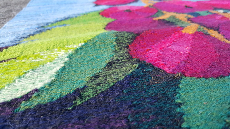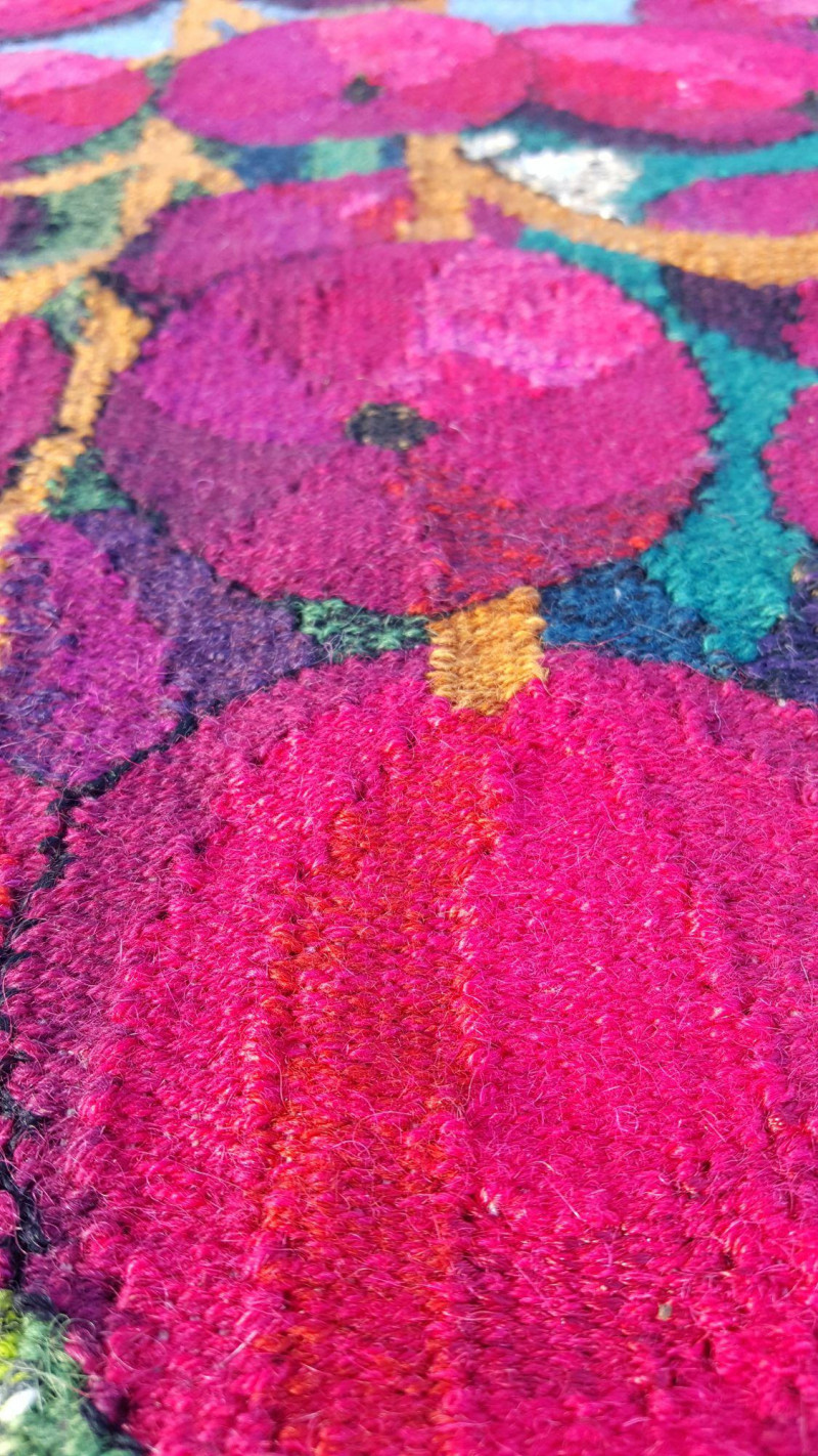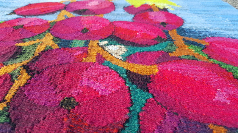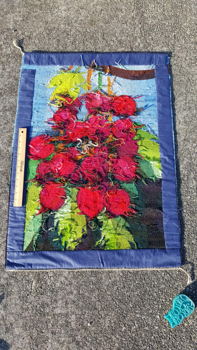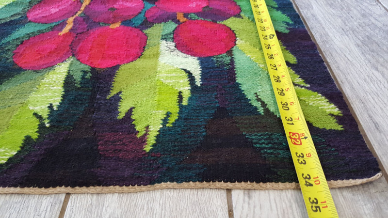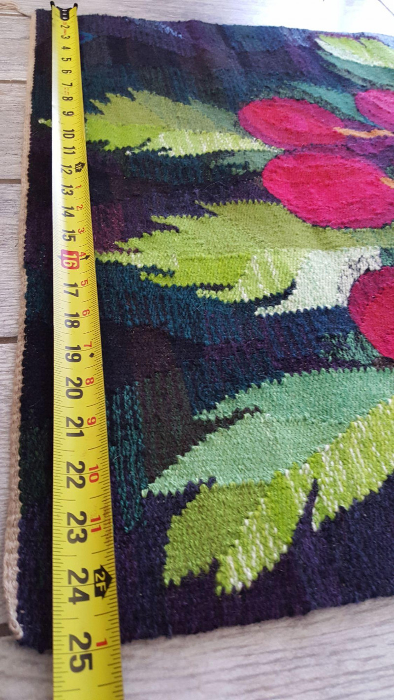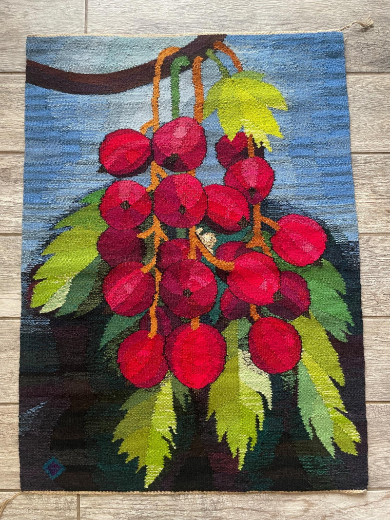 Handwoven Wool “Versus” Flemish Style Tapestry Striking handwoven wool tapestry created in the traditional Flemish “versus” style, featuring a bold still-life composition of vibrant red fruit hanging from a branch against a soft sky-blue background. Rich greens, deep browns, and layered shading give the piece depth and dimension, while the detailed leaves and clustered fruit create a dramatic focal point. The weaving displays a dense wool pile with strong color saturation and painterly transitions, characteristic of Flemish-inspired textile art. The balanced composition and vivid palette make it suitable as a wall hanging or decorative textile accent. Details: Handwoven wool construction Flemish “versus” style design Fruit and foliage motif Strong, vibrant color palette Approx. 25" x 35" Suitable for wall display A beautiful decorative textile that adds vibrant color to traditional, rustic, or eclectic interiors. Please review photos for condition.