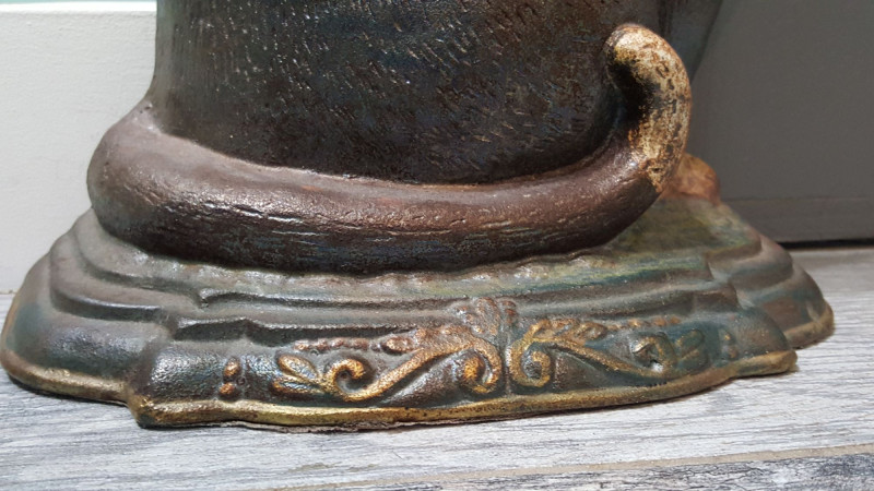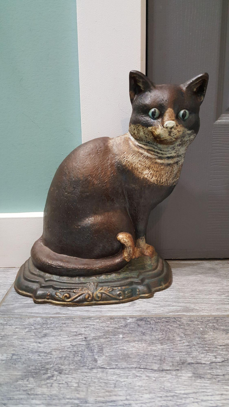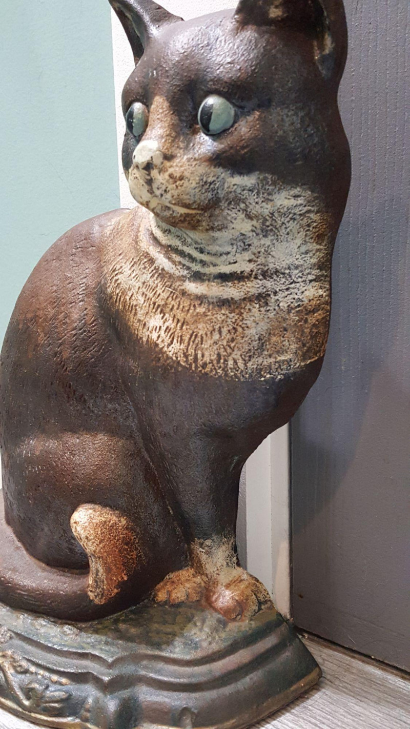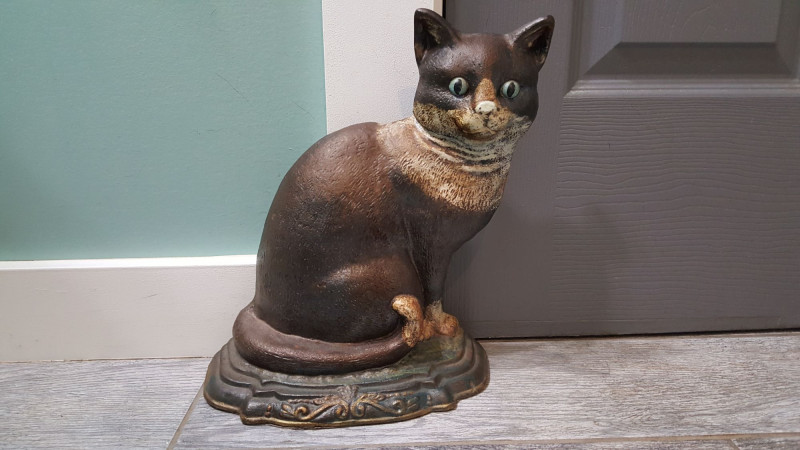 Charming and substantial cast iron door stop in the form of a seated cat, featuring expressive green eyes and hand-painted detailing. The figure shows a beautifully aged finish with warm brown tones and subtle distressing that enhances its vintage appeal. The cat is posed upright with tail wrapped around its body, resting on a decorative molded base with scrollwork accents. Heavy cast iron construction provides excellent stability and functional weight, making it both a practical door stop and an eye-catching decorative piece. Features: Solid cast iron construction Hand-painted details with aged patina finish Expressive green glass-style eyes Decorative molded base Substantial weight for functional use Please review photos for condition.