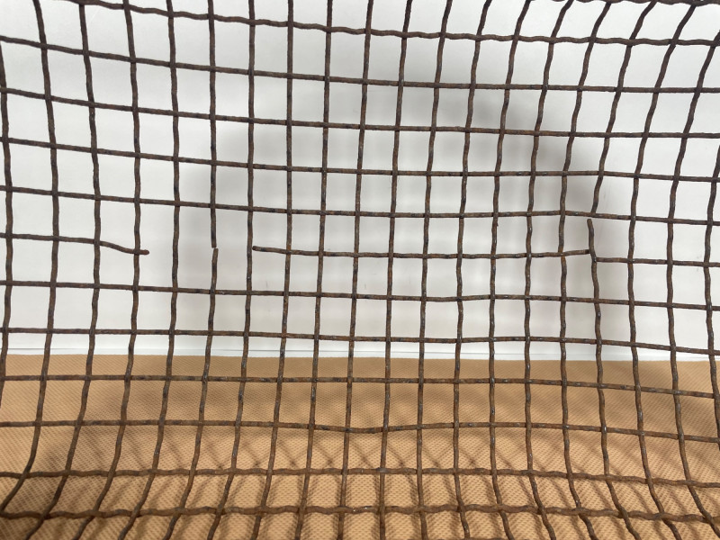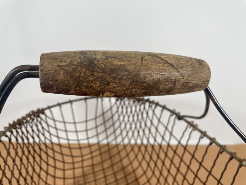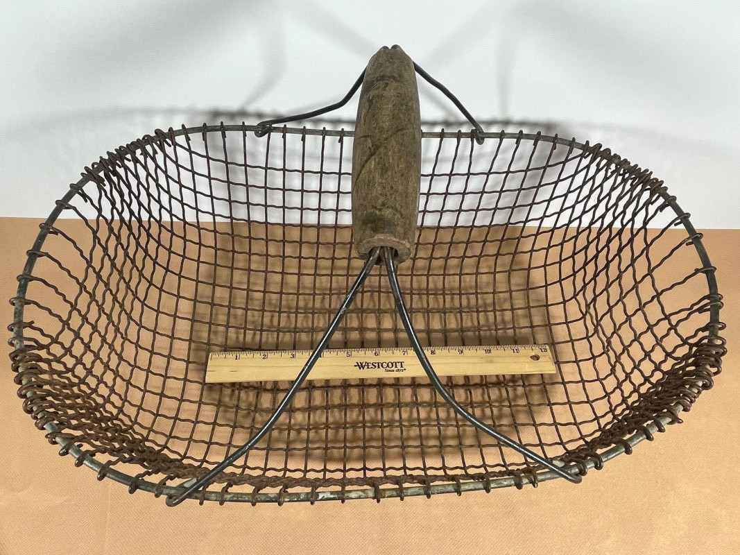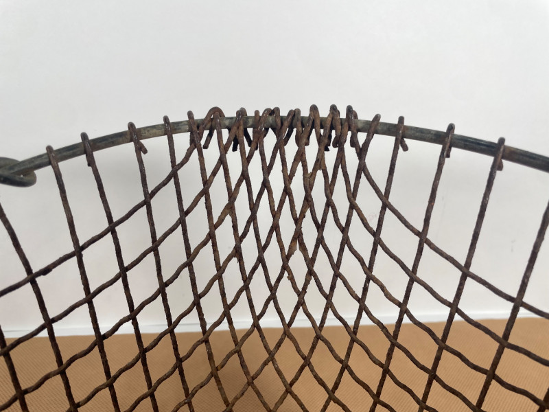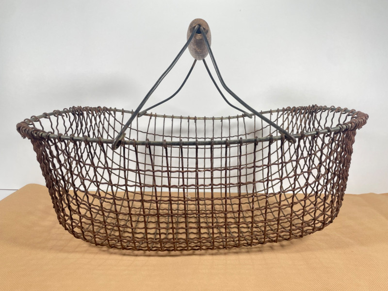 Antique Wire Market Basket Charming antique wire basket featuring hand-formed metal mesh construction and a sturdy swinging handle. The oval form and open grid design are characteristic of early European market and farm baskets, often used for gathering eggs or produce. The basket displays a naturally aged patina with warm rust tones that enhance its authentic rustic character. The reinforced rim and cross-braced handle provides strength while the open wirework allows for ventilation — ideal for eggs, and vegetables. Features: Hand-formed wire construction Oval shape with reinforced rim Swinging metal handle with central grip Natural aged patina Open mesh design for ventilation Substantial antique character Please review photos for condition and craftsmanship details.