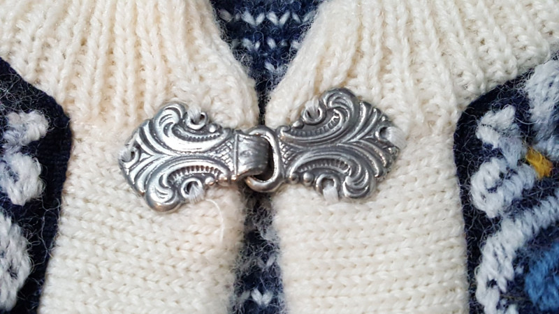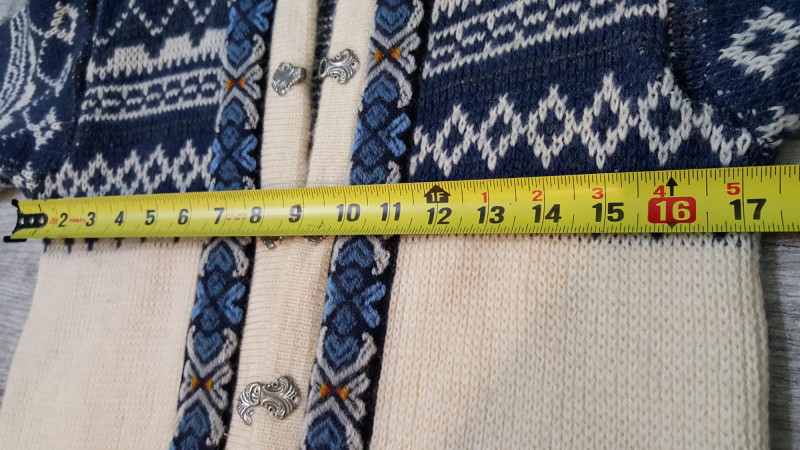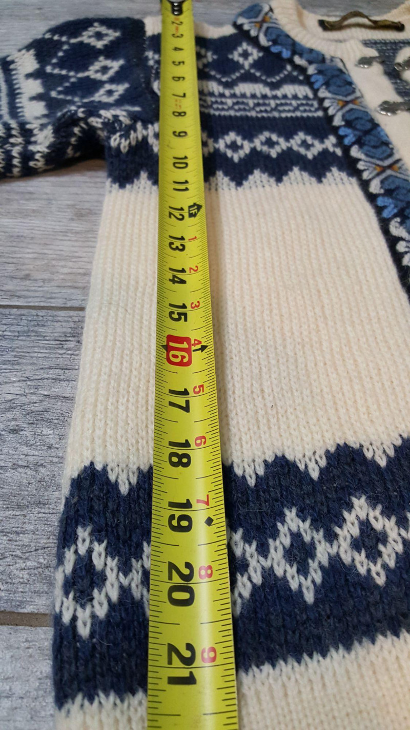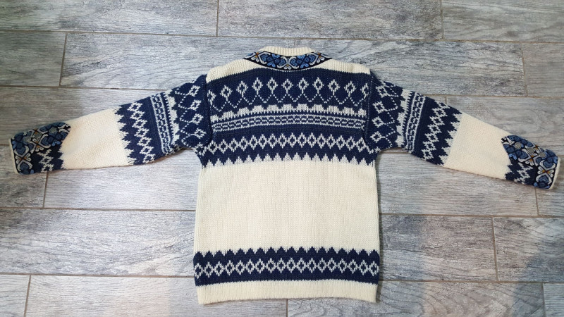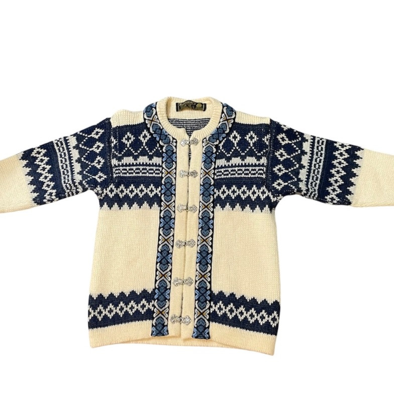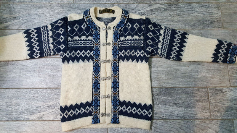 Beautiful handmade wool sweater by Nordstrikk featuring traditional Nordic knit patterns in cream and navy with blue accent trim. Designed with a full front hook closure and decorative metal clasps for an authentic Scandinavian look. Warm, cozy, and perfect for fall and winter wear. A timeless piece of Nordic craftsmanship in great overall condition.