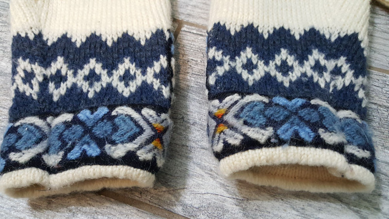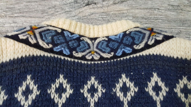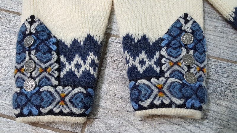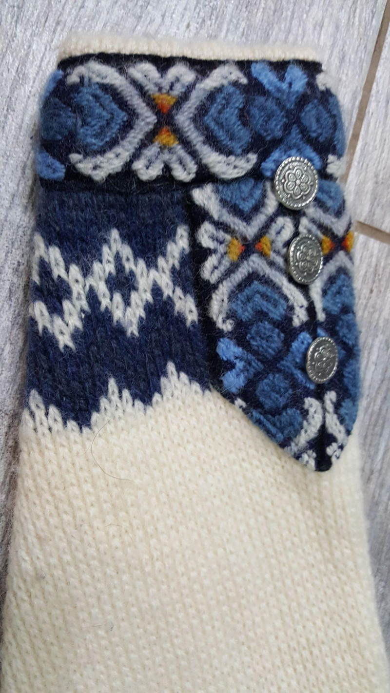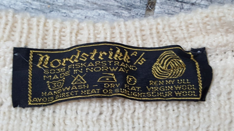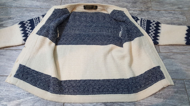 Beautiful handmade wool sweater by Nordstrikk featuring traditional Nordic knit patterns in cream and navy with blue accent trim. Designed with a full front hook closure and decorative metal clasps for an authentic Scandinavian look. Warm, cozy, and perfect for fall and winter wear. A timeless piece of Nordic craftsmanship in great overall condition.