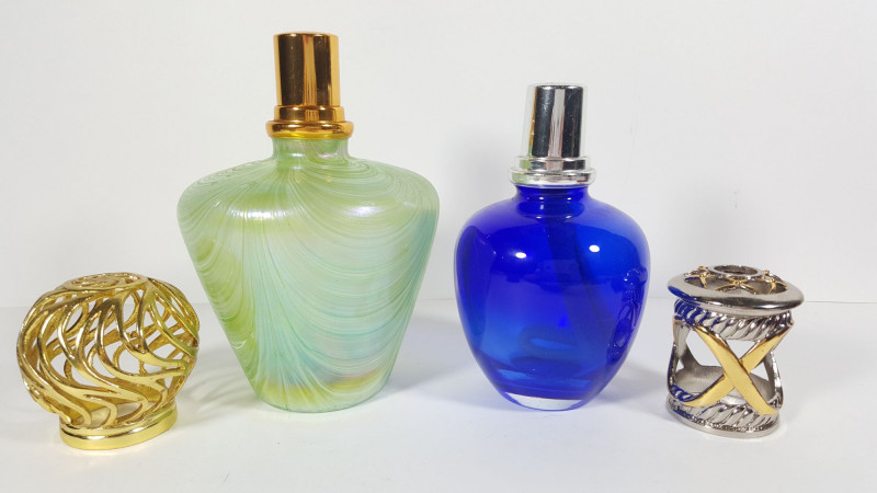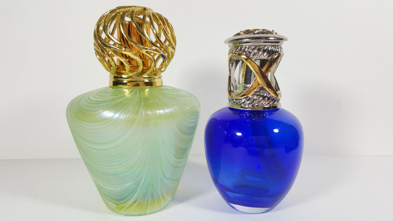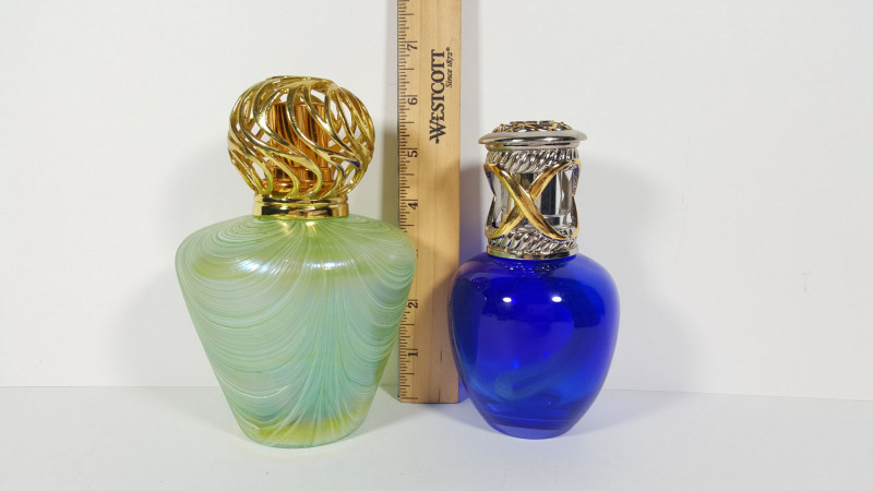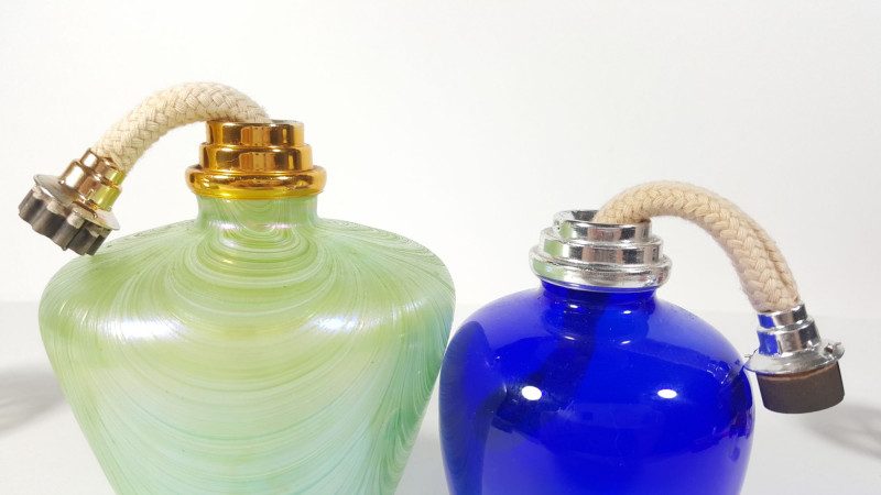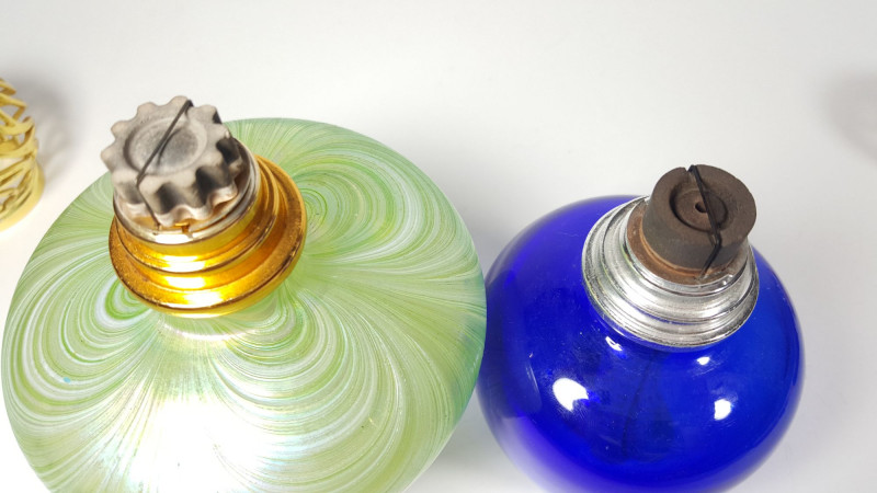 Attractive set of two art glass oil lamps featuring vibrant colors and ornate metal burners. One lamp displays a swirled light green glass body with a gold-tone openwork cap, while the other features a rich cobalt blue glass body with a silver- and gold-tone decorative burner. Both are beautifully crafted.