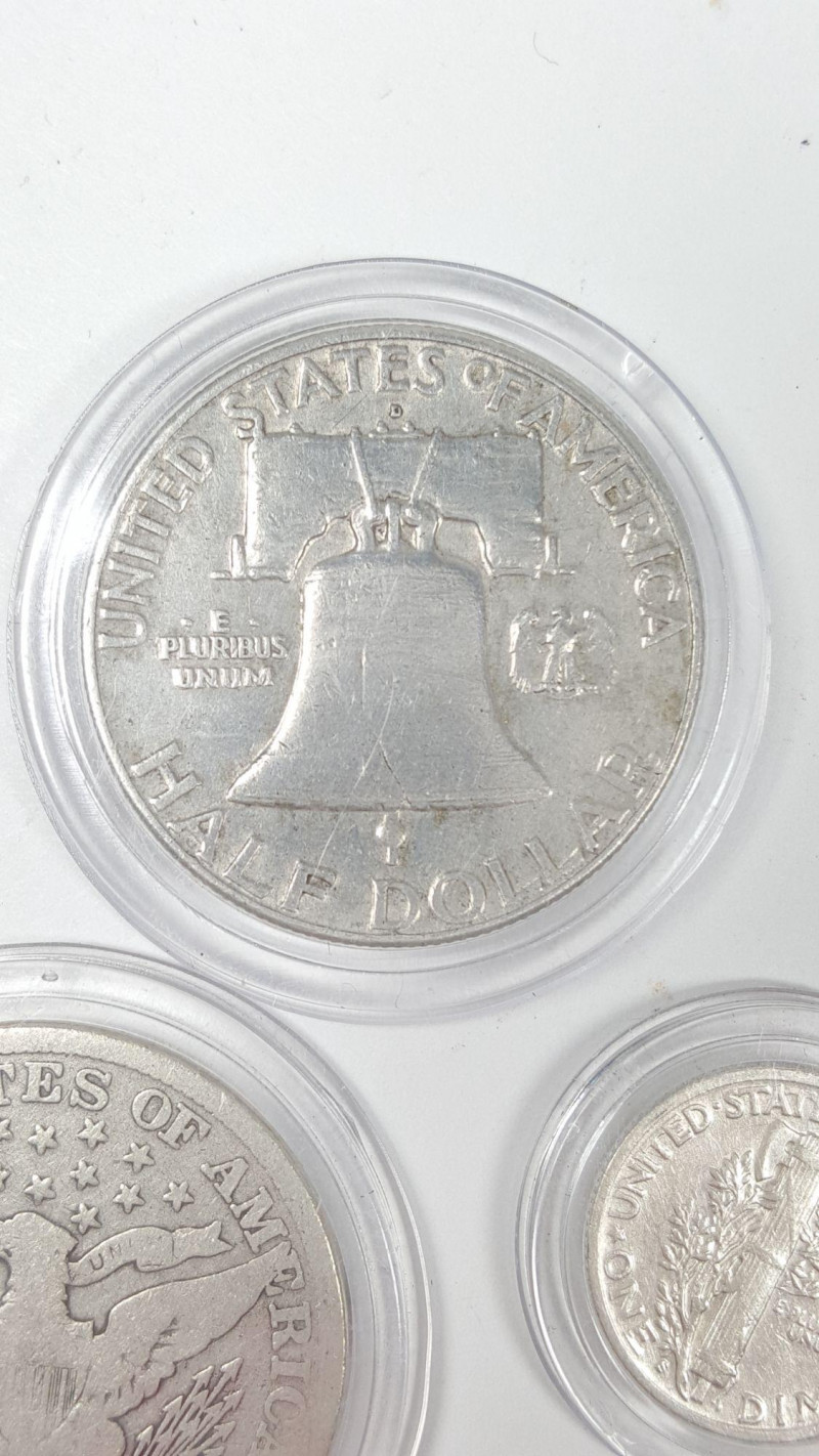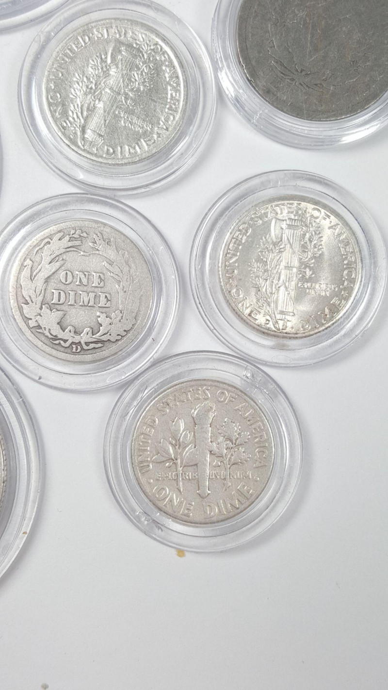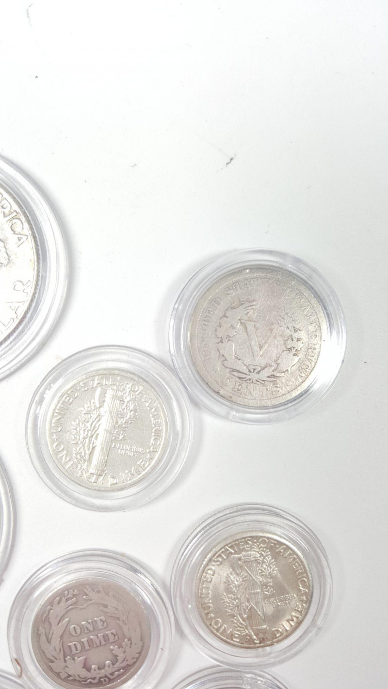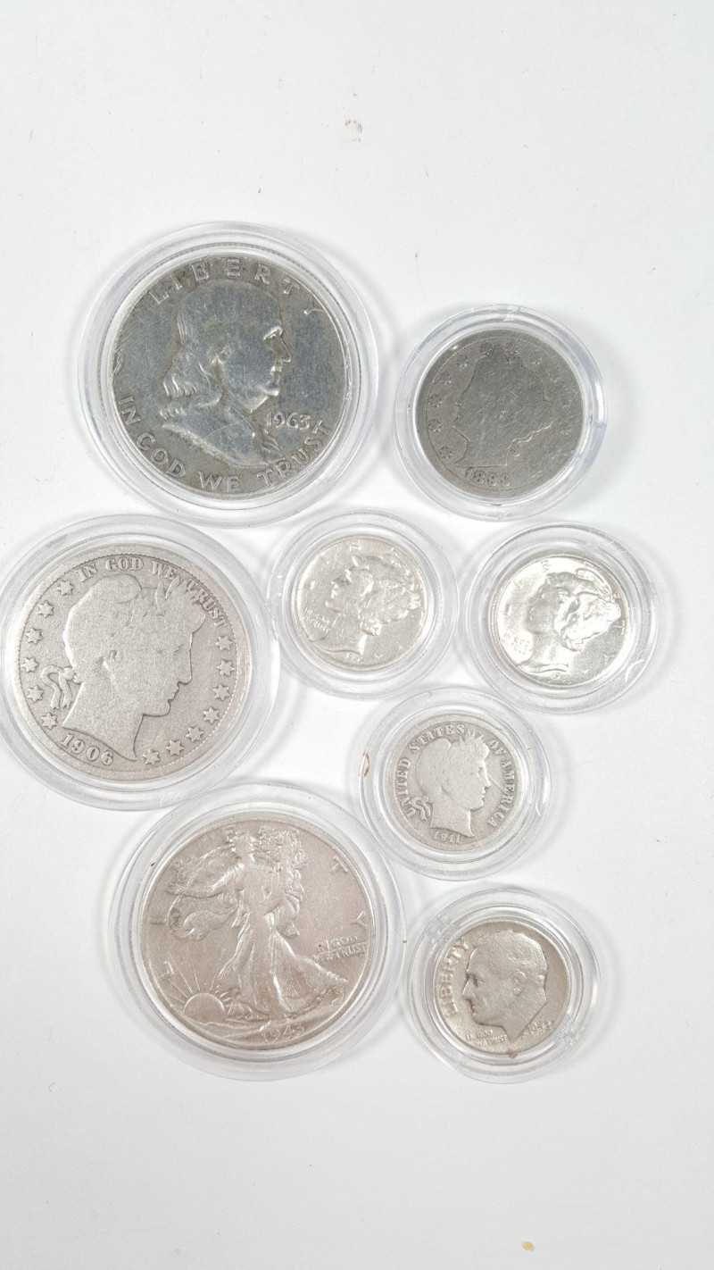 Assorted U.S. Silver Coin Collection Lot of assorted United States silver coins housed in protective capsules. Includes a mix of vintage and mid-20th century pieces such as a 1963 Franklin Half Dollar, Walking Liberty Half Dollar, Barber Half Dollar, Mercury Dime, Roosevelt Dime, Washington Quarter, and other silver coinage. Coins show circulated condition with visible wear consistent with age. A nice grouping for collectors, investors, or anyone adding to a silver collection. Please review photos for exact dates, mint marks, and overall condition.