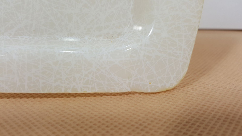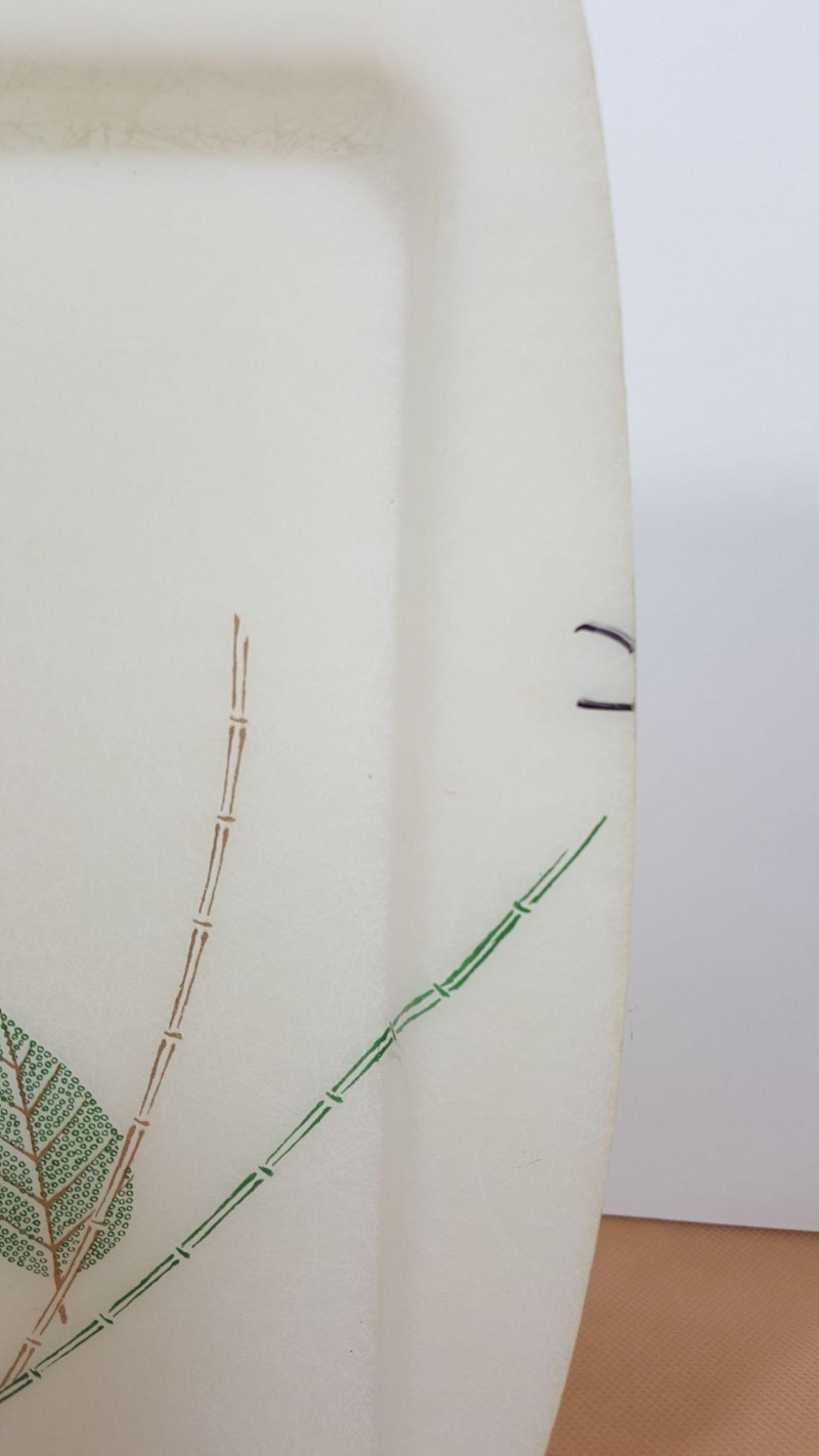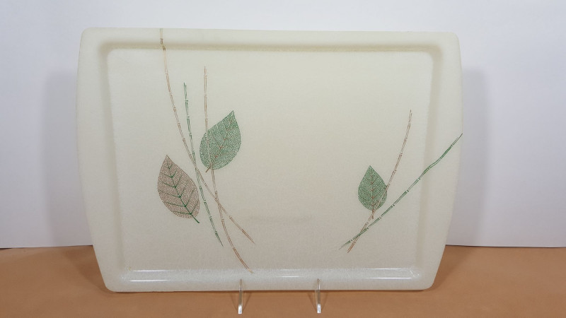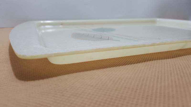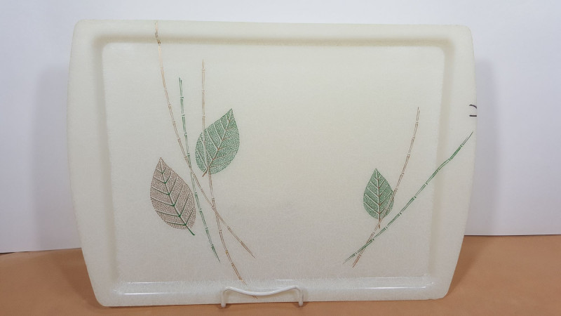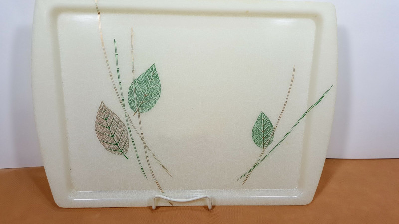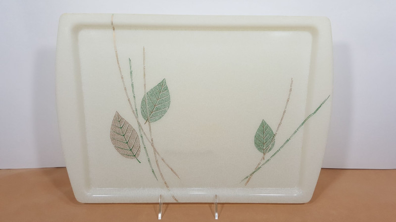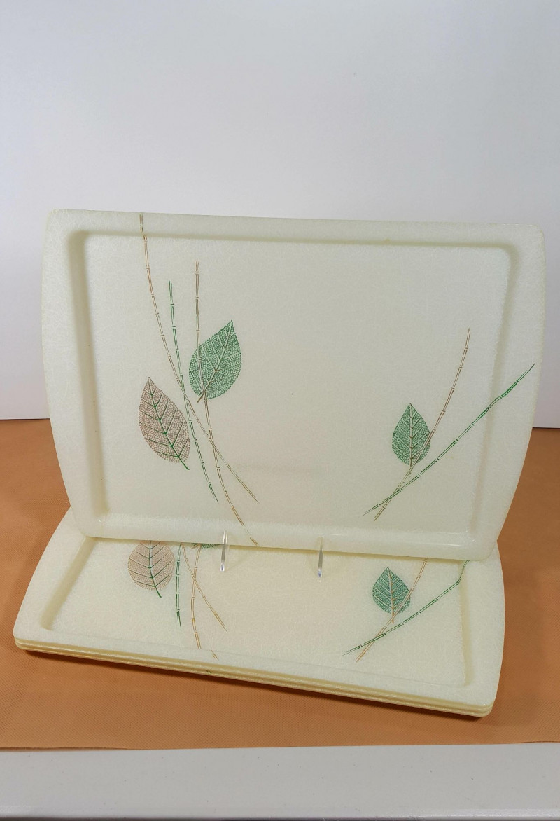 Vintage Mid-Century Serving Trays – Set of 4 (17” x 12”) Charming set of four vintage serving trays featuring a classic mid-century leaf and branch motif in soft green and brown tones. Each tray measures approximately 17” x 12” and has a raised edge for easy carrying. Perfect for entertaining, display, or retro kitchen décor. These trays appear to be made of laminated fiberglass (often referred to as melamine or molded fiberglass), a popular material for mid-century housewares due to its lightweight yet durable construction and distinctive textured finish. A great addition for collectors of retro kitchenware.
