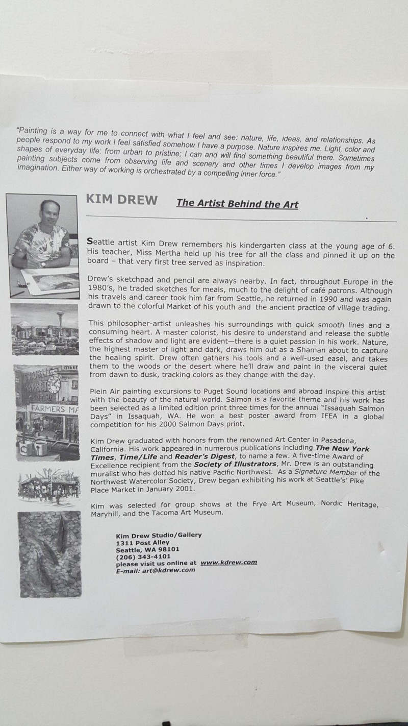 Beautiful signed print by Kim Drew, featuring an iconic view of the Seattle Public Market. This vibrant art piece captures the energy and charm of Pike Place Market with rich colors and fine detail. Professionally framed and ready to hang, the print includes the artist’s signature, enhancing its appeal for collectors and Seattle art lovers alike.
