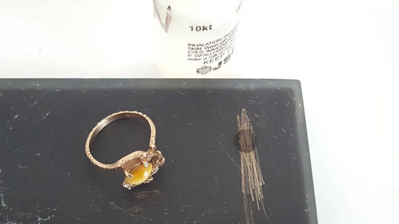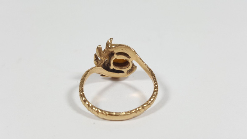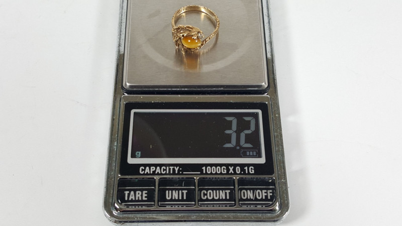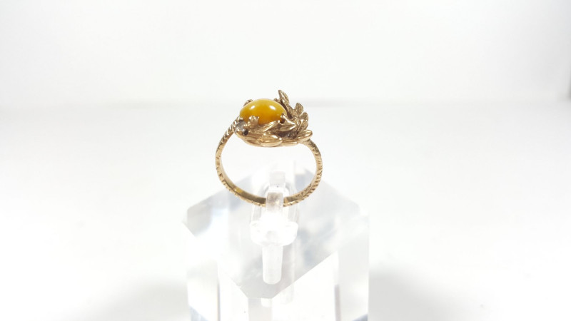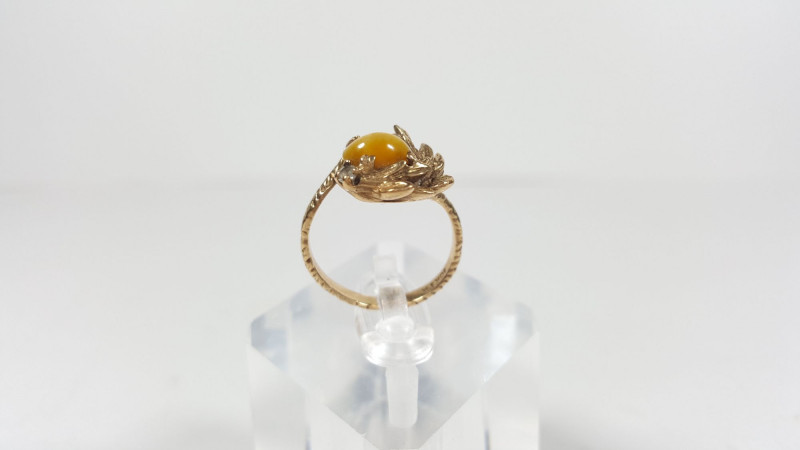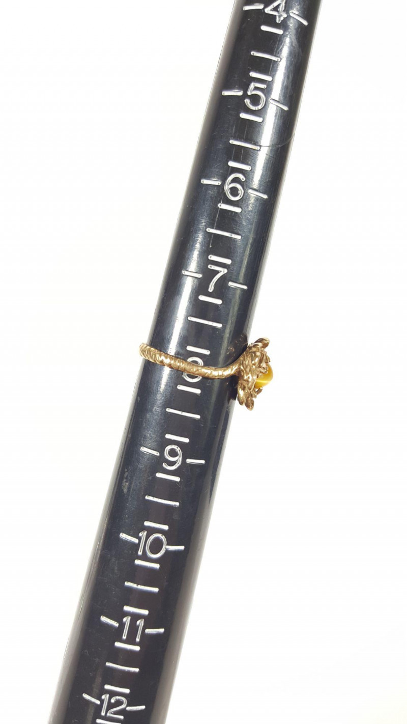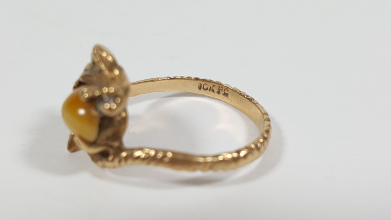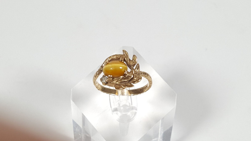 10K Gold Diamond & Tiger’s Eye Ring Striking 10K yellow gold ring featuring a polished tiger’s eye cabochon with rich golden-brown chatoyancy at the center. The gemstone is framed by an ornate, sculptural setting accented with small sparkling diamonds, adding contrast and subtle brilliance. The flowing, dimensional design gives the ring a bold vintage-inspired look while highlighting the natural beauty of the tiger’s eye stone. Please review photos for overall condition.