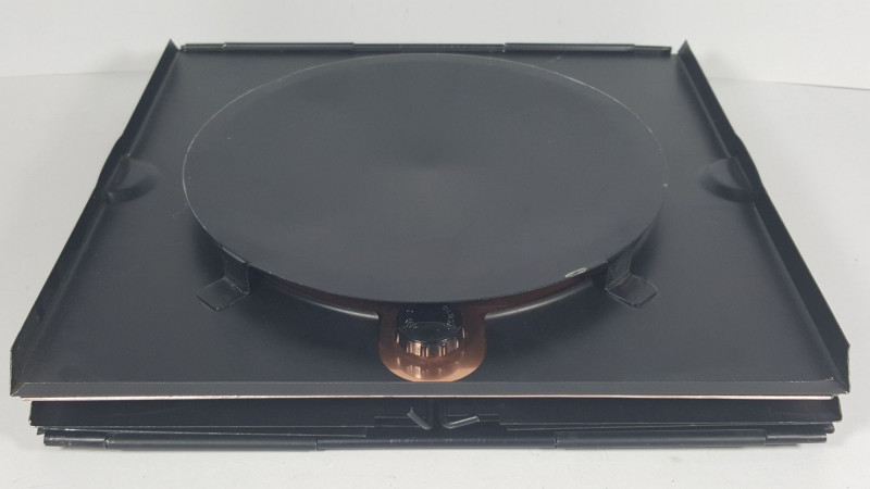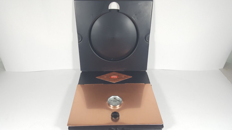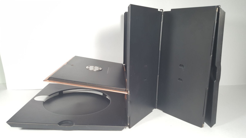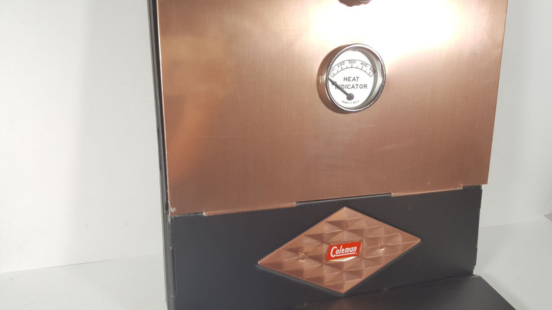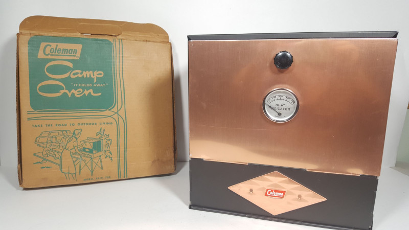 Portable, foldable oven that sits on top of a camp stove. Has built in heat indicator. Includes a rack with adjustable height settings. Box dimensions 12 x 12