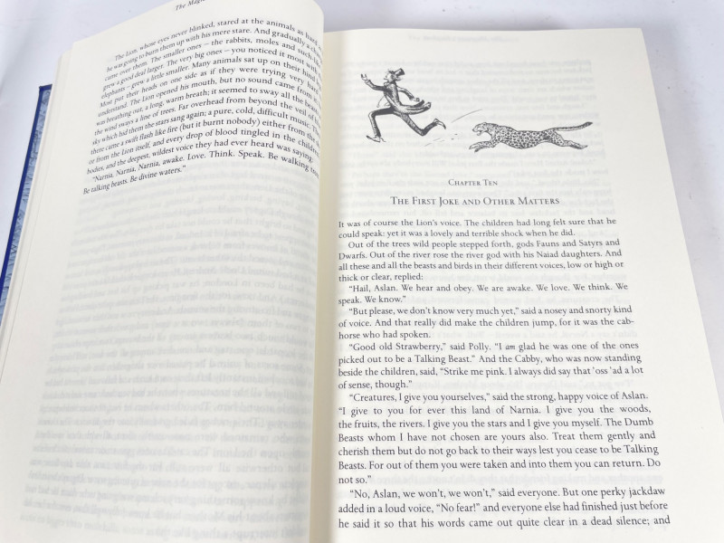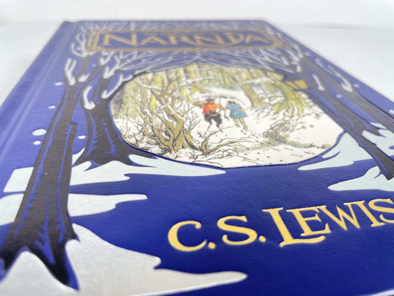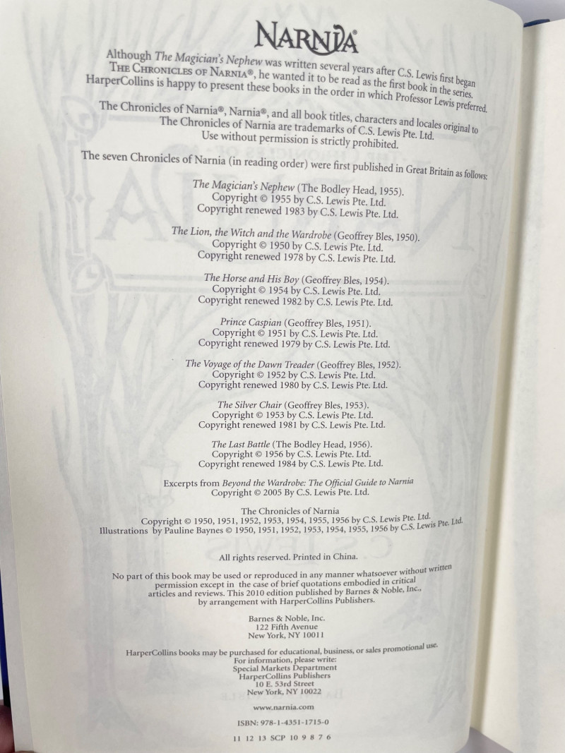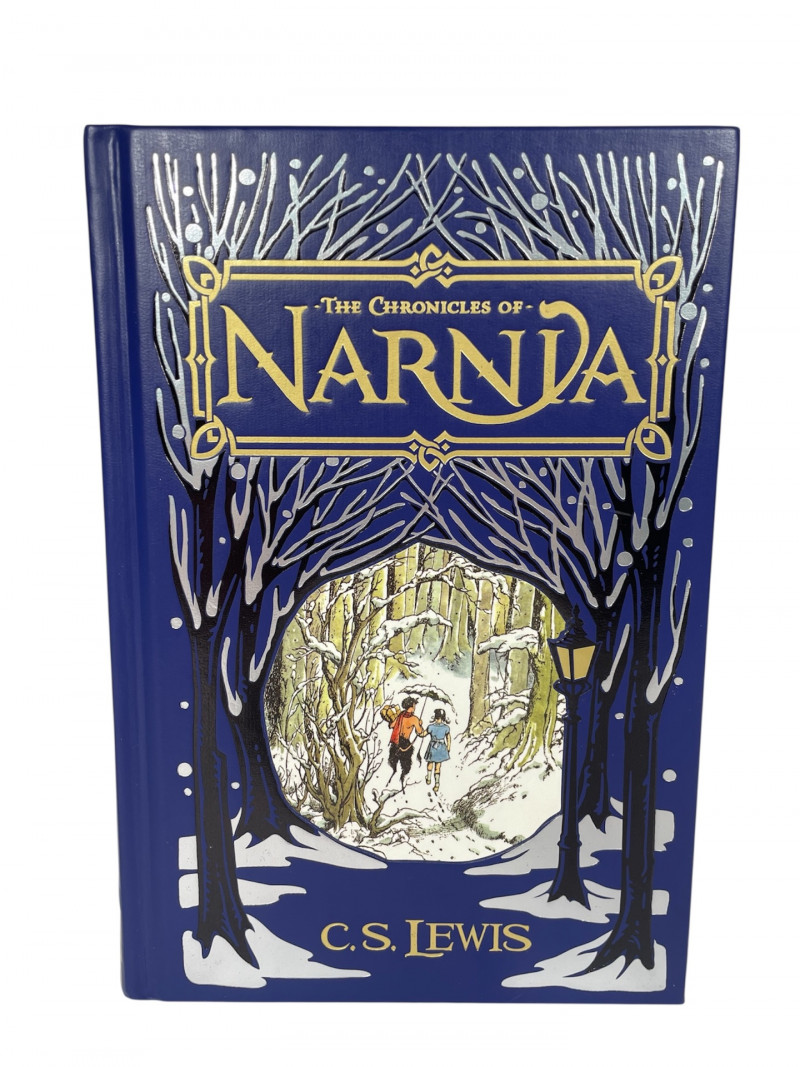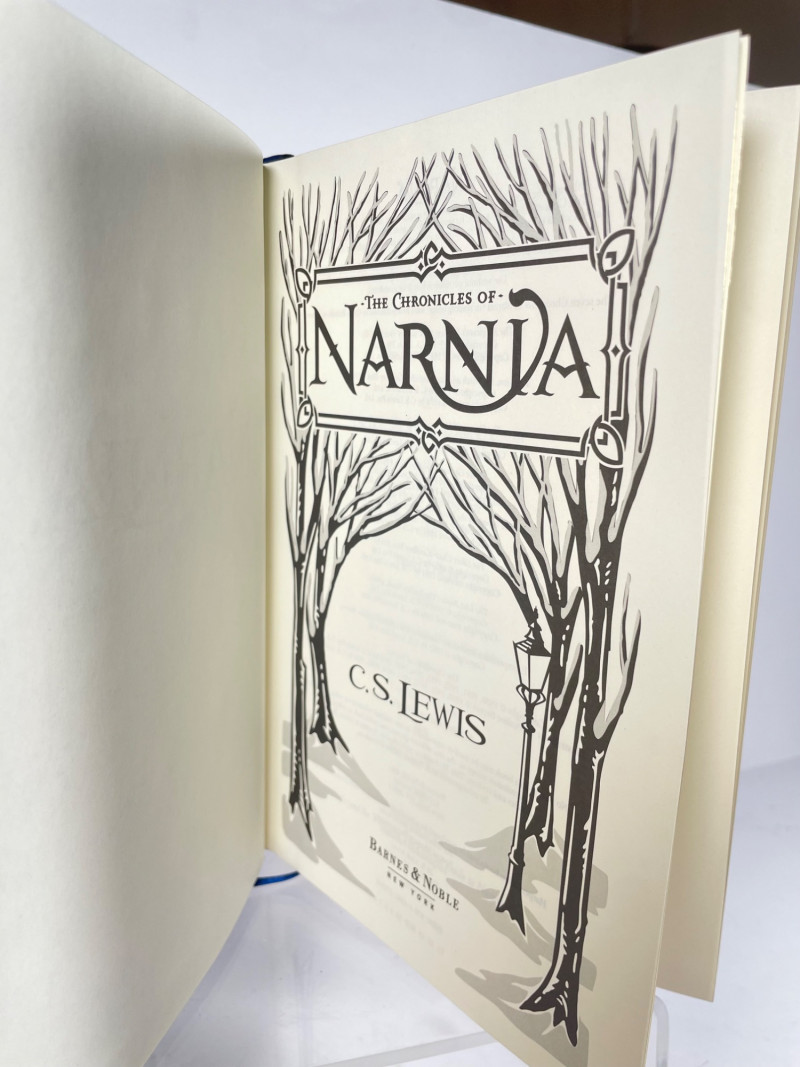 The Chronicles of Narnia by C. S. Lewis – 2010 Barnes & Noble Illustrated Hardcover Edition A handsome 2010 hardcover edition of The Chronicles of Narnia, published by Barnes & Noble. This beautifully designed volume contains all seven classic Narnia novels in one complete collection. The richly illustrated cover features the iconic winter scene inspired by The Lion, the Witch and the Wardrobe, framed in deep blue with gold lettering and decorative detailing. Designed as part of Barnes & Noble’s collectible hardcover series, this edition is known for its sturdy binding, high-quality paper, and gift-worthy presentation.
